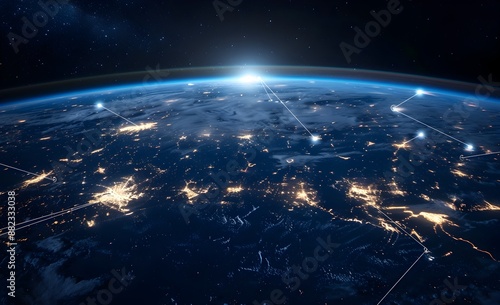 A wide shot of the Earth from space, with glowing city lights forming lines and connections across its surface, symbolizing global connectivity and technology's role in connecting people around the wo