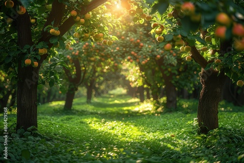 A wide view of a sunlit apple orchard filled with ripe apples on the branches, creating a tunnel effect, and sunbeams filtering through the leaves, symbolizing harvest time.