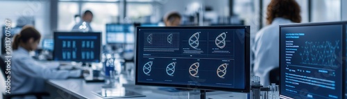 A wideangle shot of a biotechnology lab with scientists analyzing cell cultures on digital displays