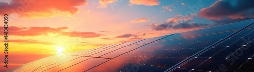 A wideangle shot of a solar energy farm with rows of solar panels under a bright sky, Solar Energy, Sustainable and powerful