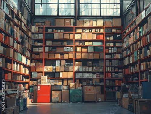 A wideangle shot of high shelves filled with neatly organized boxes, Warehouse, Expansive and detailed