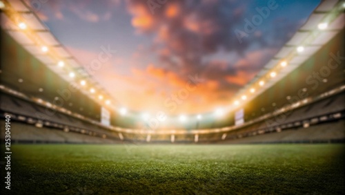 A wide-angle view of a football stadium with blurred details, captured at sunset, highlighting the vibrant sky and illuminated field. Ideal for background use