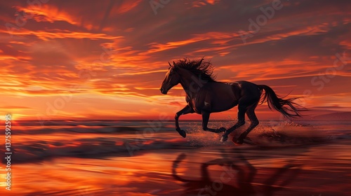 A wild horse runs free on the beach at sunset. The sky is ablaze with color, and the horse's mane and tail are flowing in the wind.