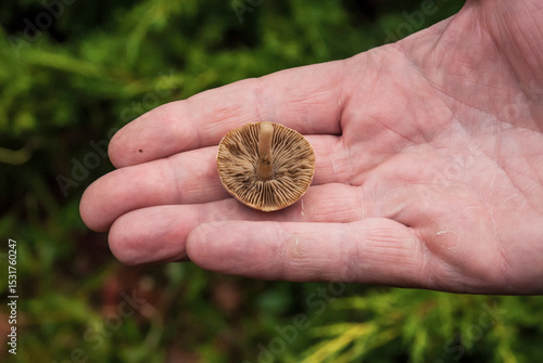 A wild mushroom held upside down in a hand to show scale and reveal the gills on the underside of the cap_20101106_4278.