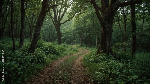 A winding, overgrown path leading into a dense, mysterious forest. An invitation to explore.