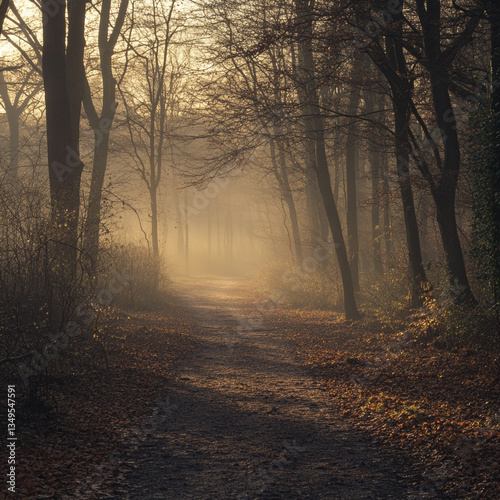 A winding path through a misty forest with bare trees and fallen leaves under a golden light glow at dawn