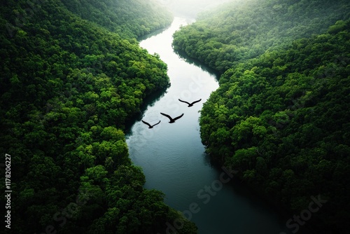 A winding river flowing through a dense forest, with birds flying above and soft ripples in the water