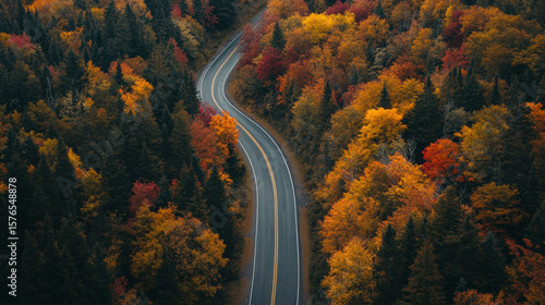 A winding road cuts through a dense forest showcasing vibrant autumn foliage in shades of orange, yellow, and red.