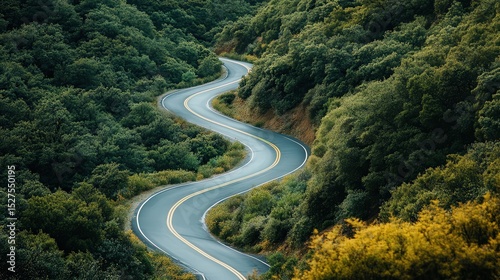 A winding road cuts through a lush green forest with trees on either side of the road on a sunny day