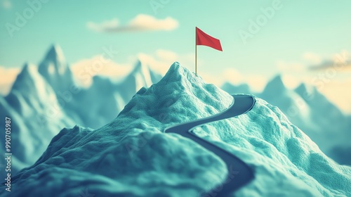 A winding road leads up a mountain to a red flag at the peak.