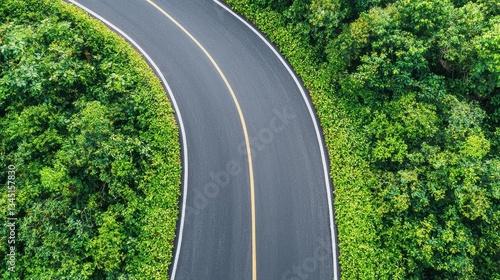 A winding road surrounded by lush greenery, showcasing nature's beauty and the contrast between asphalt and foliage.