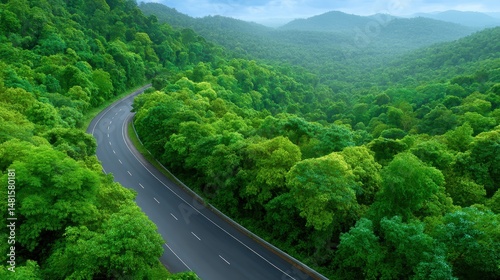 A winding road traverses a lush green forest landscape, surrounded by mountains and distant hills under a cloudy sky.