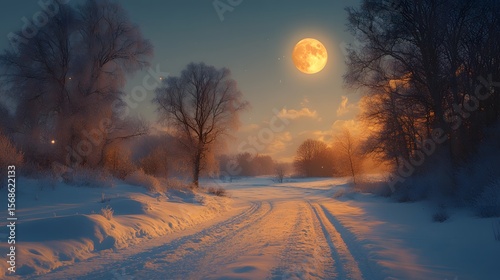 A winter landscape bathed in moonlight, showcasing a snowy road winding through a serene, snow-covered field. The sky transitions from blue to orange in this weather themed scene.