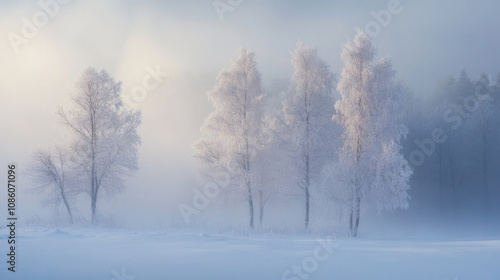 A winter landscape featuring frost-covered trees standing amidst a serene mist, creating a tranquil and peaceful scene evoking feelings of calm and solitude.