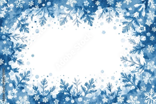 A winter-themed card featuring an abstract blue and white watercolor snow pattern that elegantly surrounds a Christmas illustration, inviting guests to a festive event