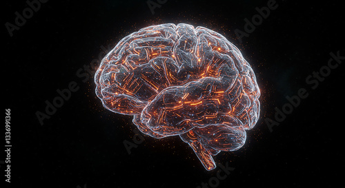 A wireframe human brain made of luminous circuits and data streams, floating in a futuristic dark space