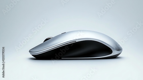 A wireless mouse with a sleek design, hyperrealistic, silver and black, isolated on white background