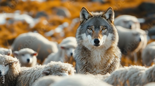 A wolf discreetly mingles among sheep, poised for action, representing hidden dangers and distinctive identity.