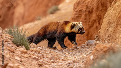 A wolverine walking along a rocky path in a natural landscape.