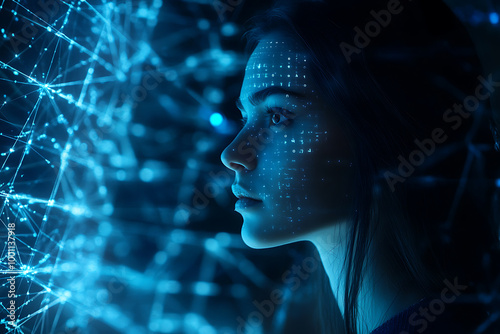 A woman analyzing futuristic holographic data, showcasing innovation and advanced technology, surrounded by binary code and designed in a wireframe plexus style.