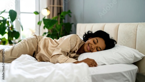 A woman asleep on a bed, bathed in soft light from a nearby window, plants visible in the background. She is relaxed and smiling