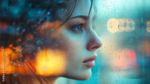 A woman gazes out a rainy window, deep in thought as reflections dance across her face, capturing an introspective and emotional moment in a cityscape setting.