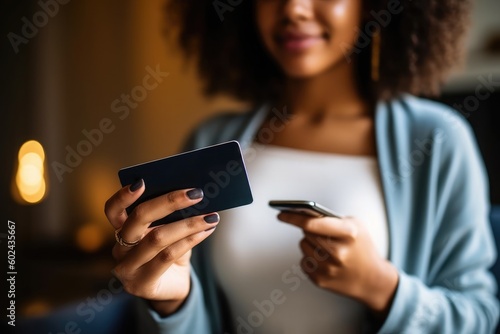 A woman holding a smart phone and a remote control in her hand Generative AI