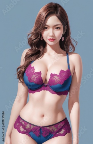 a woman in a purple and blue lingersuit posing for a picture