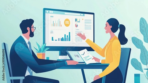 A woman in a yellow blazer points to a computer screen with data visualizations, presenting information to a male colleague sitting at a desk.