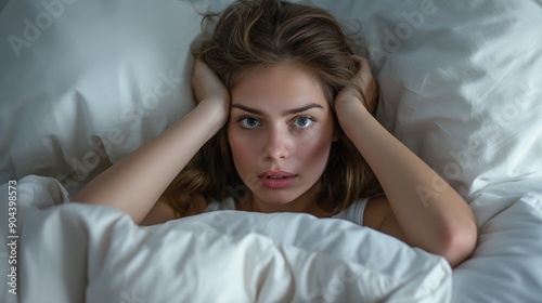 a woman in bed on a pillow suffers and cannot sleep, covers her ears with a pillow