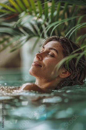 A woman is enjoying a moment of relaxation by closing her eyes while floating in a pool