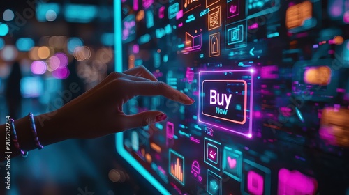 A woman is pointing at a buy button on a computer screen. The image is colorful and vibrant, with a futuristic feel. The woman's hand is hovering over the button