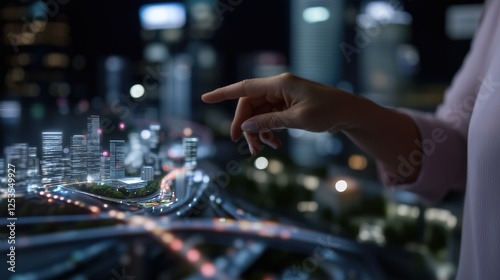 A woman is pointing at a cityscape on a computer screen. The city is lit up at night, and the woman's finger is hovering over a building
