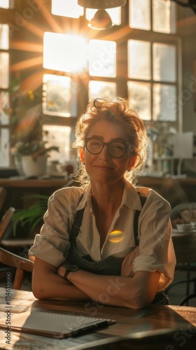 A woman is seated at a table, her arms crossed in front of her. She appears contemplative or assertive in posture, displaying a sense of reserved strength.