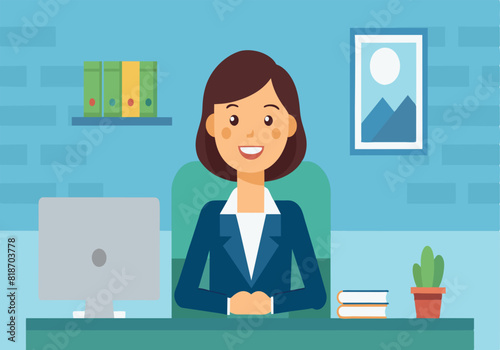 A woman is sitting at a desk with a computer and a potted plant