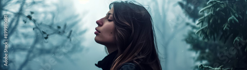 A woman is standing in a forest with snow on the ground