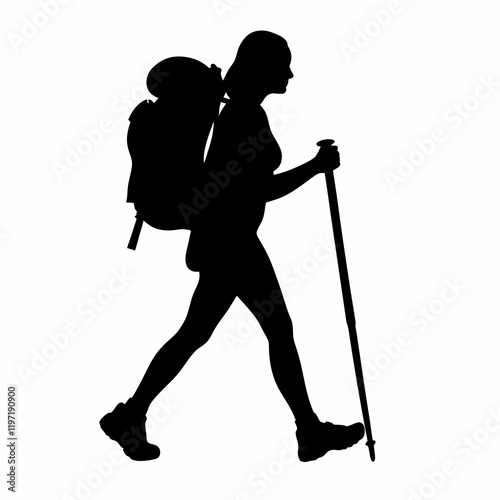A woman is walking with a backpack and a walking stick. She is wearing shorts and a backpack
