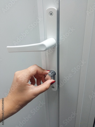 A woman opens the door lock in a public toilet. A woman's hand closes the door with a key. A door in a public toilet. Plastic door. Background, place for text.