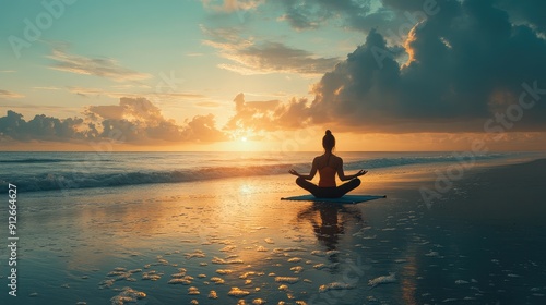 A woman practicing yoga on a beach at sunrise, embodying self-acceptance and inner peace with the serene ocean as a backdrop