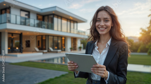 A woman realtor in a suit holding a tablet in front of a large house. She is smiling and she is happy.