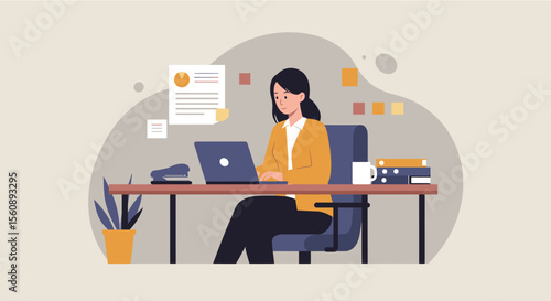 a woman seated at a desk, engrossed in work on a laptop, surrounded by office supplies and a plant. Suitable for landing page, banner, marketing, web design, presentation, infographic, etc.