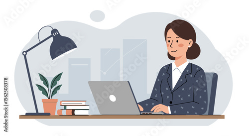 a woman seated at a desk, engrossed in work on a laptop, with a lamp beside her and a plant on the desk. Suitable for landing page, banner, marketing, web design, presentation, infographic, etc.