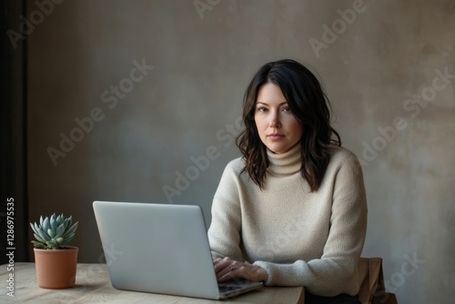 A woman sits at a table, working on her laptop, in a cozy setting.