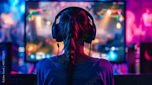 A woman sits in front of a TV, wearing headphones and focusing on the screen.