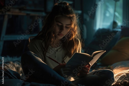 A woman sits on her bed reading a book, a cozy and intimate scene