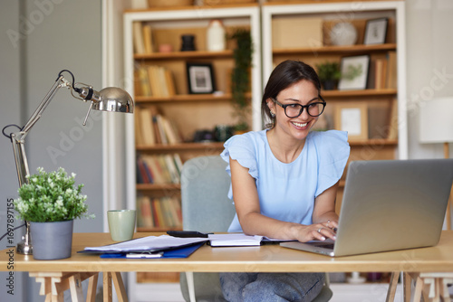 A woman smiles while working on her laptop in a well-organized home office, surrounded by wooden shelves filled with books and decorative items, showcasing an inviting atmosphere.