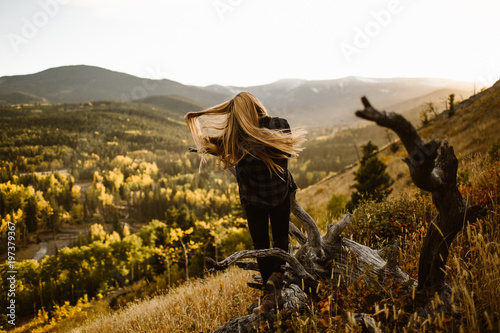 A Woman Standing on the Side of a Hill with the Wind Blowing Her Hair
