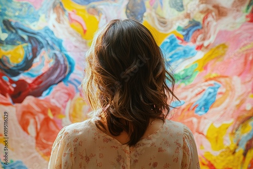 A woman stands admiring a vibrant artwork