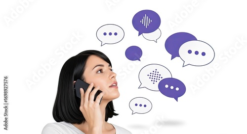 A woman talks on her smartphone with purple speech bubbles representing communication and voice technology.