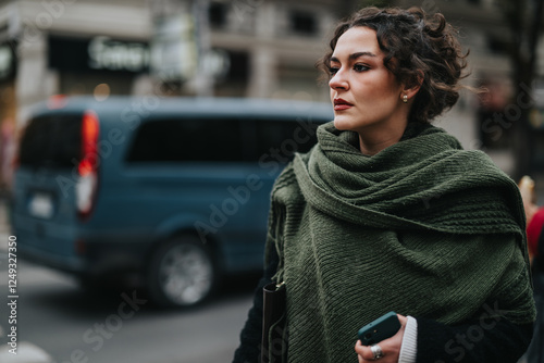 A woman wearing a green shawl stands on a city street, holding her phone and looking contemplative. Urban background features vehicles and blurred architecture, creating a dynamic urban atmosphere.